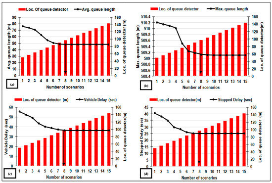 MOE for 15 scenarios at the 6th roundabout: (a) queue length (m); (b) max. queue length (m); (c) vehicle delay (sec); and (d) stopped delay (sec).