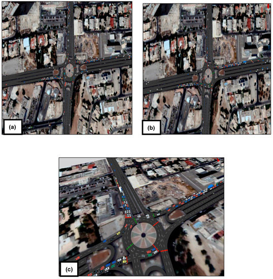 Therefore, the optimal position for the queue detector was determined by evaluating all possible scenarios, and a VISSIM model was utilized to accurately assess the adaptive metering method with four parameters: the length and maximum length of the queue, as well as the delay per car and the stopped delay. The experiment was run for 15 scenarios, and the results showed significant improvements in vehicle delay, stopped delay, and queue length. Between scenario 2 and scenario 5, the controlled approach experienced a reduction of 12.17 s in vehicle delay (from 52.41 to 40.24 s), a decrease of 5.65 s in stopped delay (from 38.12 to 28.47 s), and a decrease of 19.03 m in queue length (from 73.90 to 54.87 m). From scenario 5 to the scenario 8, the control delay was reduced by 6.19 s (from 40.24 s to 36.45 s), the stopped delay decreased by 3.35 s (from 28.47 to 25.12 s), and the queue length was reduced by 6.70 m (from 54.87 to 48.17 m). The optimization of the queue detector for all scenarios was determined to be 96.9 m in scenario 8, as shown in Figure 5. No further changes were observed after scenario 8, as the values of vehicle delay, stopped delay, and queue length remained consistent. Overall, the signalized sixth roundabout performed better than the conventional roundabout, with a LOS of D, an average delay of 36.45 s, and a maximum queue exceeding 509.14 m. As demonstrated in Figure 4, there were significant improvements in LOS, average delay, and maximum queue length, and the details of simulated outputs of scenario 8 are shown in Table 4c. Figure 6 presents the best scenario from the simulation video in VISSIM: (a) indicates long queues at the north, west, and east directions and the green light activated in the longest queue at the north direction; (b) indicates long queues at the west and east directions and the green light activated in the longest queue in the west direction; and (c) indicates long queues at the west, east, and north directions and the green light activated in the longest queue in the east direction.
