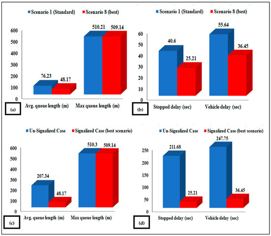 Comparison between the standard scenario (scenario 1) and the best scenario (scenario 8) at the signalized sixth roundabout: (a) queue length (m) and (b) delay (sec). Comparison between the signalized case with the best scenario and the un-signalized case at the sixth roundabout: (c) queue length (m) and (d) delay (sec). Results are presented with an error bar equal to 0.5.