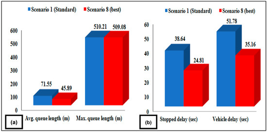 A simulation of the best detector under various traffic scenarios was conducted using VISSIM software at a selected roundabout. The best scenario (scenario 8) was compared with the base condition at the standard value of queue detectors (scenario 1) using four parameters (MOE), two based on the delay of the entire intersection and two based on queue length. The new model was compared with both the base scenario and the best scenario, and the percent change is shown in Table 5a. The model demonstrated good improvement over the base scenario (at 50 m), with the best improvement shown in scenario 8, which was located 96.9 m from the stop. All four measures of effectiveness demonstrated improvement, with the maximum queue length showing the best change from 76.23 m to 48.71 m, denoting a 28% change. However, the maximum queue length did not show significant improvement from 510.21 m to 509.14 m, representing a 1.07% change. The average delay per vehicle and the stopped delay time at the roundabout showed significant improvement, with a 19.19% improvement in vehicle delay from 55.64 s to 36.45 s and a 15.485% improvement in stopped delay from 40.60 s to 25.12 s (see Figure 7). These improvements demonstrate the effectiveness of the adaptive signal strategy and highlight the importance of selecting an optimal queue detector location based on all relevant parameters.