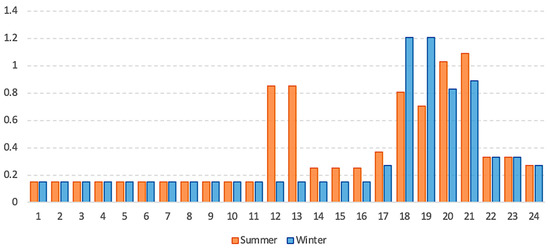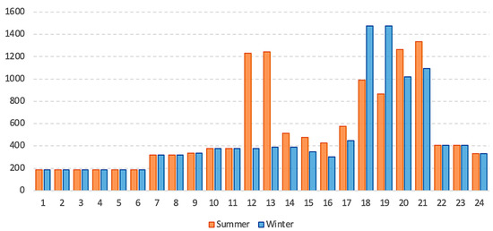 The total load demand of the township was assessed mainly based on the energy requirements of the township after investigation and research. Table 1 shows the common electrical appliances used by each household and the corresponding power. We also evaluated the energy use of local agricultural cultivation, schools, hospitals, and other public facilities, and assessed the energy load data for different seasons to create realistic load curves [21] and the details are shown in Table 1 and Table 2. The average annual load demand was 12,094.67 kWh/day, with a load factor of 0.34, a peak demand of 1336.22 kWh/h in summer, and a peak demand of 1477.35 kWh/h, mainly in the evening between 18H and 21H. Two hydrogen-fueled vehicles were deployed locally, each driving 100 km per day with 80 g of hydrogen per km [22]; setting a stochasticity of 10% and 20% deviation of hours, the system required 16 kg/day of hydrogen load. Figure 1 and Figure 2 demonstrate the variation of the total load demand for a household and the township, respectively.