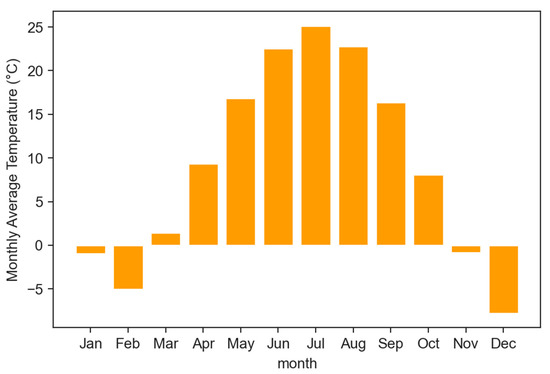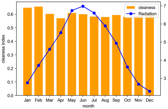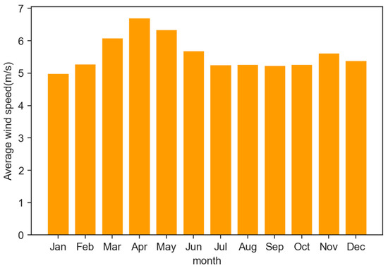 The village of Bayin Wusu, with coordinates 106.32° N, 39.67° E, has a typical temperate continental climate with an average annual temperature of 7.8–8.1 °C. Meteorological data for the study area were retrieved from the National Aeronautics and Space Administration’s Meteorology and Solar Energy Database. Figure 3 shows the local monthly average temperature; Figure 4 shows the local wind energy resources, with an average wind speed in Bayin Wusu Village of 5.6 m/s. From Figure 4 and Figure 5, we can see that the selected location has a reasonably good availability of solar irradiation and wind speed and therefore, there is great potential to develop wind energy resources here. The annual average solar radiation of Bayin Wusu Village was 4.7 kWh; Figure 5 shows the local solar radiation data and the atmospheric clearness index, and from Figure 5 we can see that the solar radiation in this place was mainly concentrated in May and June in summer and drops to the lowest level in November and December in winter, which shows that the local photovoltaic energy has strong characteristics of uneven spatial and temporal distributions. The development of HRES to improve the stability of energy production is an ideal solution.