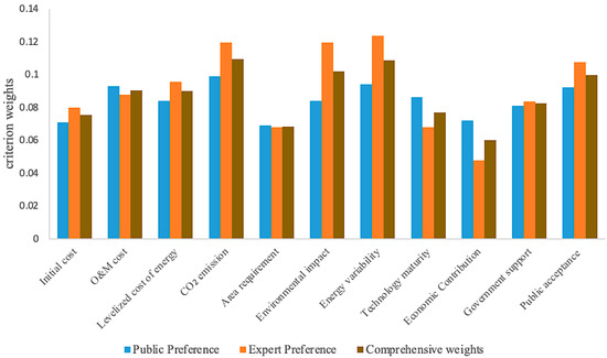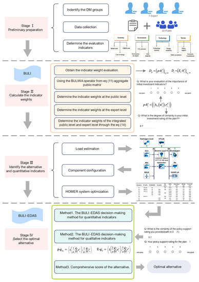 The selection of HRES alternatives is a typical MCDM problem. Previous studies have studied it from different perspectives. The design optimization of the renewable energy system configuration in the Beijing Xiongan New Area was simulated by HOMER software to address the limitations of a single decision method; three different MCDM methods were used to determine the indicator weights and select the optimal system configuration [6]. Taking into account the ambiguity and uncertainty of evaluation information, the IVHF-ELECTRE II method for ranking renewable energy options was proposed and a case study was conducted in China [7]. Researchers have conducted technological and economic analyses of grid-connected and off-grid HRES systems and found that grid-connected HRES systems produced more CO2 [8]; therefore, more attention has been paid to the design optimization and technical analysis of implementing stand-alone HRESs. An integrated decision model was developed and applied to a design optimization analysis of 100% clean energy system scenarios in rural Pakistan to determine the best alternative for the grid and off-grid scenarios [9]. An off-grid hybrid renewable energy system using hydrogen batteries through HOMER was simulated and the results showed that the hybrid energy storage system using hydrogen batteries was the most beneficial [10]. The existing studies investigated how to select the optimal energy system solution based on MCDM from different perspectives. However, the public’s willingness was rarely considered, particularly in the problem of measuring the social acceptability of energy portfolios; simply having experts provide ratings on a single technology is insufficient, and further research is needed, particularly on the topic of public participation.