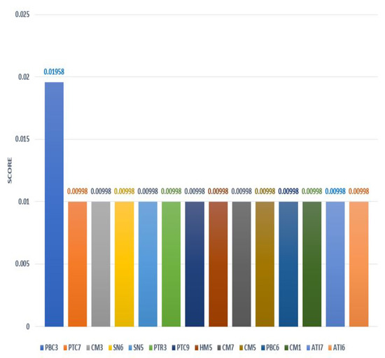 The illustrated y-axis values in Figure 1 are the importance scores of the corresponding x-axis features. In permutation importance, positive score values held a significant value compared to zero and negative values. Hence, zero and negative values were eliminated from the subset. A total of 14 subfeatures were extracted as part of the important subset through filter selection’s permutation importance. The importance score for each subfeature is presented in Table 3. The presented optimal feature subset had an accuracy value of 88.2743%.