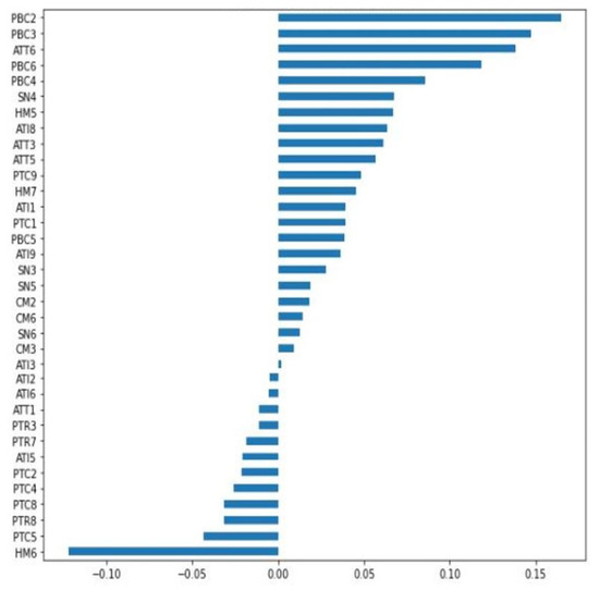 Figure 2 demonstrates the coefficient scores on the x-axis and subfeatures on the y-axis. In the LASSO approach, important subfeatures are non-zero values [37]. Thus, the optimal feature subset had positive or negative coefficients. A total of 35 out of 59 subfeatures, approximately 59.32%, were considered important for the LASSO model (Table 6). Nevertheless, they were not ranked based on coefficient value because the LASSO subset would undergo another machine-learning algorithm. The remaining 24 features were eliminated and found unimportant since they were penalized to have zero coefficients. Moreover, LASSO’s alpha value was 0.0007, and LASSO’s accuracy was 76.5950%.