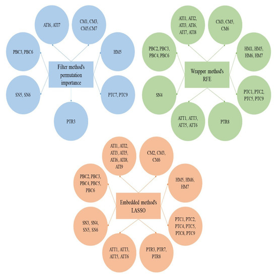 An artificial neural network (ANN) is capable of processing human-behavior-related data by applying pseudocode iteratively [43]. Hence, the ANN parameters were identified beforehand. First, the ANN’s input layers were identified based on the feature selection’s optimal subsets. Specifically, 7 input layers or features (ATI, CM, HM, PTCs, PTRs, SNs, and PBC) were determined for permutation importance. Meanwhile, 8 input layers or features (ATI, CM, HM, PTCs, PTRs, ATT, SNs, and PBC) were discovered through RFE and LASSO. These input layers contained varying subfeatures dependent on the feature-selection results. Second, 10, 20, and 30 nodes for the hidden layer were tested [9,43,62]. These nodes can be represented using the following equation:
