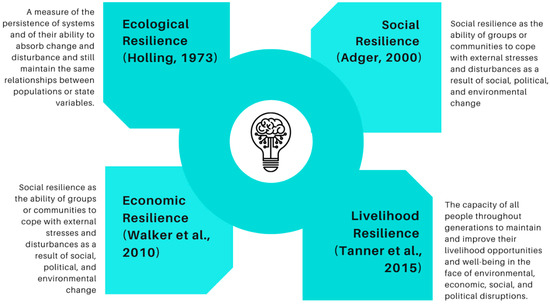 Resilience is a broad term; it can be further classified into ecological, social, economic and livelihood resilience, as shown in Figure 2 below. Adger [33] defines social resilience as the ability of groups or communities to adapt to social, political, and environmental change. This definition emphasizes social resilience in relation to ecological resilience, which is the ability of ecosystems to survive disturbances. There is a clear link between social and ecological resilience, especially for groups or communities that rely on natural resources for survival. However, whether resilient ecosystems enable resilient communities is unclear [39]. In addition to that, looking at the social-ecological perspectives, Folke [34] defines resilience as an approach and a way of thinking that provides a valuable context for the analysis of social-ecological systems, which is an area of explorative research that has policy implications for sustainable development. Tanner et al. [16] define livelihood resilience as “the capacity of all people throughout generations to maintain and improve their livelihood opportunities and well-being in the face of environmental, economic, social, and political disruptions.” Jones et al. [30] recommend three approaches to ensure resilience measurement: must be able to be quickly deployed at critical junctures; evidence requirements will change as a result of the various stages of risk preparedness and recovery; and should be organized as a collaborative effort. Patel et al. [40] discussed the shift among the actors in prioritizing “disaster vulnerability” to “disaster resilience,” which can be taken as a more proactive and positive action. The essence of the resilience concept is that it captures the factors that enable individuals and organizations to function in adverse circumstances. The study of resilience draws on a wide range of disciplinary ideas and approaches, and certain aspects of the social sciences have parallels with those of the natural sciences. Resilience is determined by the degree to which they adhere to norms, demonstrating that resilience can be either a descriptive or a normative concept, or a combination of the two [41].