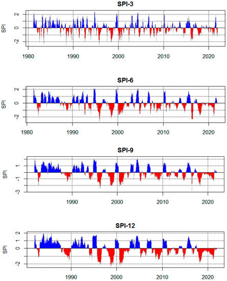 The SPI values at different time scales: 3 months (SPI-3), 6 months (SPI-6), 9 months (SPI-9), and 12 months (SPI-12). The blue portions indicate wet periods while red portions indicate dry periods.