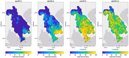 The spatial distribution of total dry severity (TDS), average dry severity (ADS), and maximum dry severity (MDS) of dry events is displayed in Figure 8. All severity maps show a similar pattern as of duration maps. The map shows that TDS is relatively high in the basin’s central to southeast regions, which shows the more extreme dry events that occur in these parts of the LMB. The reason for higher TDS could be the lack of sufficient rainfall during the wet season; the lower amount of rainfall is caused by the delayed arrival and the early departure of the monsoon rainfall combined with El Nino events, which result in exceptionally high temperatures and evapotranspiration. The TDS, ADS, and MDS ranges for SPI-3, 6, 9, and 12 are given in Table 3.