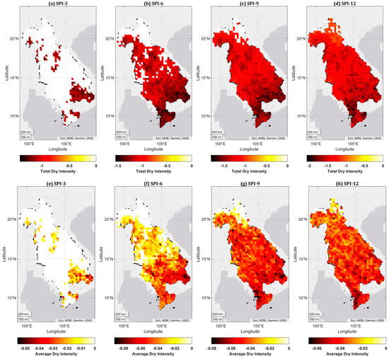 The intensity of the dry events was computed as the ratio between severity and duration, and its spatial distribution is illustrated in Figure 9. The figure shows the total (TDI), average (ADI), and maximum (MDI) dry intensities for the LMB region across the time period. The total dry intensity varies from moderately dry to extremely dry with a range of 0 to −1.403 for SPI-3, 0 to −1.545 for SPI-6, 0 to −1.806 for SPI-9, and −1.034 to −2.067 for SPI-12 (Table 4).