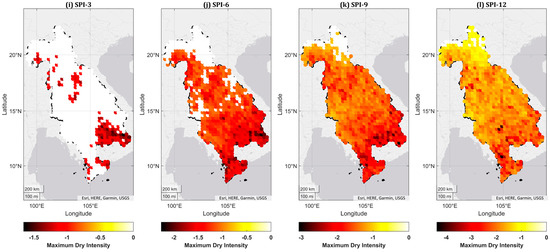 Spatial distribution of total dry intensity (a–d), average dry intensity (e–h), and maximum dry intensity (i–l) for the period of 41 years (1981–2021).