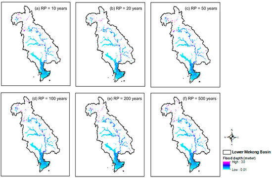 Figure 11 depicts the flood-prone areas for flood events with six return periods: (a) 10, (b) 20, (c) 50, (d) 100, (e) 200, and (f) 500-year. A large area in the LMB has a relatively shallow inundation water depth. The high-water depth, nearly 30 m (in purple color), is found in an upper basin region and along the mainstream of the Mekong River. However, although potential inundation depths are low to average water depths, the southern part of the basin is highly prone to flooding, with a higher frequency of occurrences than the northern part.