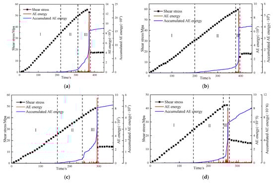 It can be seen from Figure 9a that when the shear stress reaches the compaction stage (OA) of the granite, no acoustic emission energy is detected, indicating that the original microcracks inside the granite at this stage are gradually closed under the action of external forces, and no new cracks are generated. When the loading continues, the granite enters the linear elastic deformation stage (AB), and the acoustic emission event is still not monitored in the first half of it, which is still in the quiet period. During the quiet period, the cumulative energy curve of acoustic emission remains at a very low value, and the slope of the curve is almost unchanged. At the initial stage of the linear elastic deformation stage of granite, the internal microcracks are in the incubation stage. At the initial stage of crack initiation, the generated elastic wave is too weak to be transmitted to the rock surface and captured using the acoustic emission probes. Therefore, the acoustic emission signal is in the quiet period.