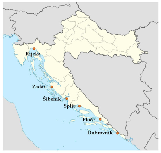 Figure 2 displays the six state-owned ports in Croatia: Rijeka, Zadar, Šibenik, Split, Ploče, and Dubrovnik. Further information provides concise port specifics []: