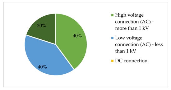 Figure 3 shows the status of shore power supply type in a state-owned port. According to it, high-voltage connections with more than 1 kV are available in 40% of the ports, while connections with less than 1 kV are accessible in another 40% of the ports studied. Twenty percent of the ports have no shore power connection, and the DC connection is not available for all ports studied.