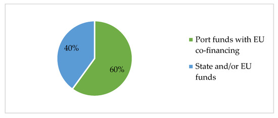 Regarding the funding preferences (Figure 5) for cold ironing technology infrastructure, 60% of the ports’ experts opted for dual funding with port funds and European Union co-financing. On the other hand, 40% of the port experts prefer exclusive funding from state and/or European funds.