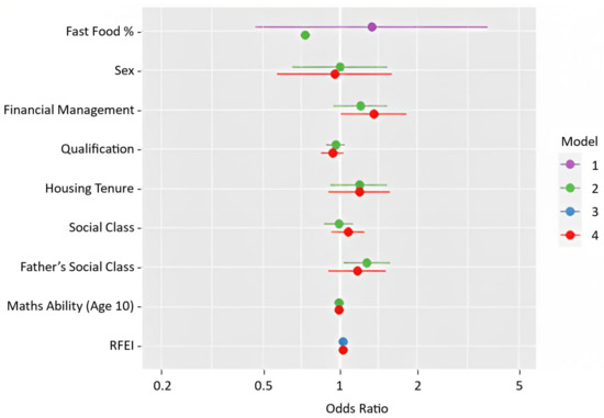 Table 7 shows the regression output of a multivariable logistic regression analysis of the binary obesity variable against two key independent variables: fast-food proportion (FFP) and RFEI. The table shows Models 1–4, corresponding to logistic regression models estimated under four different scenarios. The odds ratios estimated through the four models during the three time points are also shown in Figure 1, Figure 2 and Figure 3. A higher fast-food proportion was associated with higher odds of being obese at all three time periods. In Sweep 9, the odds of being obese were 2.41 (95% CI: 1.70, 3.41; p < 0.001) in areas with high fast-food proportion; during CSW1, this rose to 2.89 (95% CI: 1.55, 5.39; p < 0.001); and in CSW2, the odds were 1.34 (95% CI: 0.47, 3.82; p < 1). Once the models were adjusted for covariates including sex, income and qualification, the figures were 1.87, 2.23 and 0.73, respectively. It can be argued that these covariates attenuated the relationship to an extent. With adjustment, the odds of being obese remained much higher in areas with a higher fast-food proportion except in the second COVID-19 survey where the odds of being obese did not increase.