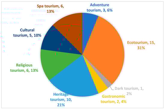 Cultural tourism involves travel to destinations to learn about the local cultural heritage, history, ethics, values and traditions. It often involves various activities (visiting monuments and museums, attending festivals and other cultural events, participating in cultural workshops and classes) []. Adventure tourism involves travel to destinations to participate in physically challenging and adventurous activities (ziplining, bungee jumping, rock climbing, river rafting, mountain biking, skiing, kayaking). It often involves outdoor recreation and exploration of remote and wilderness areas []. Adventure tourism can be characterized a type of wellness tourism, that appeals to those seeking self-actualization through participation in challenging activities []. Agrotourism involves travel to farms, vineyards, and other agricultural businesses to experience rural life and learn about farming practices. It often includes activities such as farm tours, farm stays, and farm-to-table dining experiences []. Volunteer tourism, also known as voluntourism, involves travel to destinations to participate in volunteer work that benefits local communities and environments. It often includes activities such as conservation work, community development projects, and teaching English as a foreign language [].