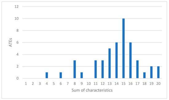 Figure 3 presents the summary of achieved characteristics of each ATEs. Most characteristics (20) are achieved by two ATEs, two ATEs achieve 19 characteristics, one ATEs achieve 18 characteristics, three ATEs achieve 17 characteristics, six ATEs achieve 16 characteristics, while 10 ATEs achieve 15 characteristics. The rest of the ATEs achieve less than 15 characteristics. It is important to note that the ATEs with the same sum of characteristics, don’t achieve the same characteristics, too. The analytical table is presented in the Appendix A.