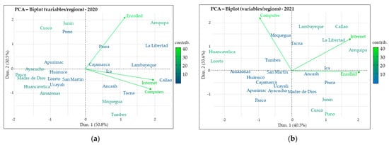 Identification of the influence on technology access on the number of enrolled university students during the pandemic: (a) year 2020, Dimension 1: internet and computers, Dimension 2: enrolled; (b) year 2021, Dimension 1: enrolled and internet, Dimension 2: computers. The Lima region was excluded because it was an outlier region. Note 1: Computer: access to desktop/laptop, Internet: internet access, Enrolled: number of university students enrolled. Note 2: PCA (Principal Component Analysis).