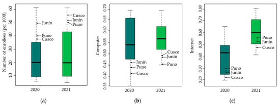 Figure 3, section (a) shows the skewness on the number of enrolled university students for both years; in 2020, 75% (quartile 2) of the regions accomplish 35,000 students attending university; for 2021, quartile 2 exceeds 40,000 enrolled university students. In section (b), for 2020 a great dispersion is shown in the distribution of the computer-access proportion for the 24 regions. Then, in 2021, the dispersion becomes more symmetrical; in other words, its index is more homogeneous. The same phenomenon happens in section (c), where the internet-access proportion in all the 24 regions is more homogeneous. It is also shown that Junín, Cusco and Puno are amongst the five regions with the highest record of enrolled university students in the country, despite their low internet and computer access indicators during the years 2020 and 2021.