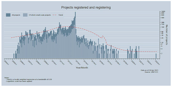 According to the United Nations Framework Convention on Climate Change (UNFCCC) [19], as of 30 April 2023, 7844 CDM projects were registered. However, due to the prolonged downward trend in CER prices, potential projects were not commercially viable and the number registered by UNFCCC [19] gradually decreased (Figure 2). Thus, the CDM has failed to consistently deliver development and sustainability benefits [20,21].