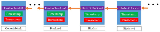 As shown in Figure 3, the first block in the chain is called the “Genesis block”. Each node in the network has an identical copy of the blockchain, where each block represents a set of timestamped transactions and a connection with the previous block. The chain of blocks is constantly growing while each new block is added [46]. Each block header contains a hash of the previous block, so there is no opportunity to imperceptibly change the transaction in the previous block [47]. The block body contains a list of verified transactions, their amounts, addresses of the parties and some other details [48]. Thus, having the last block, it is possible to get sequential access to all the previous blocks in the blockchain.