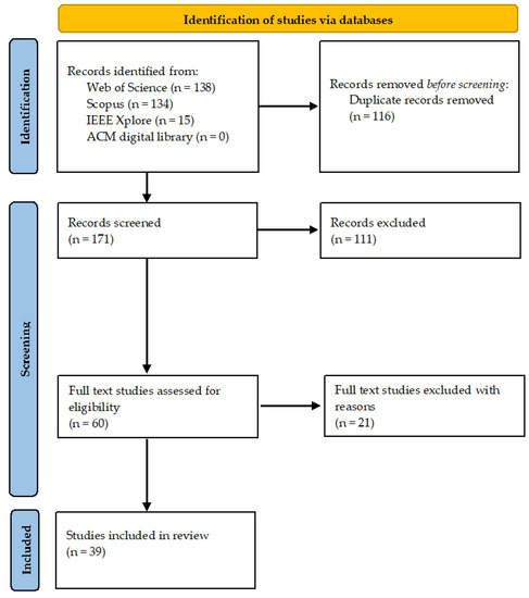 Initially, this study was supposed to conduct a search using the above protocol in four databases. However, during the search in the ACM digital library, it was discovered that access to their full contents was not provided for the 10 manuscripts found. Thus, the data from this database was not included in the identification stage. After searching in three databases, we retrieved 138 records from Web of Science, 134 records from Scopus, and 15 records from IEEE Xplore. Figure 5 is the flowchart of the PRISMA 2020 guideline [62]. As Figure 5 shows, it includes identification, screening and inclusion steps. The total number of search results from three databases was 287; 116 duplicate records were removed and 171 remained for screening stage. According to the PRISMA 2020 guideline, this stage consists of two steps: (1) titles and abstracts eligibility screening; and (2) full text eligibility screening. Therefore, 111 articles were excluded after the first step. The main reasons for records exclusion: (1) unrelated to either topic of blockchain or carbon markets (including carbon credits under ETS and carbon offsets); or (2) only related to one topic. During the next step, we assessed the remaining 60 articles for full-text eligibility. A total of 21 records were excluded for specific reasons, including: (1) superficial overview of blockchain, in some cases mixed with other Industry 4.0 technologies (e.g., IoT, AI, Big Data etc.); and (2) full-text content was not consistent with the topic of carbon markets (including carbon credits under ETS and carbon offsets). Thus, 39 records were included in the dataset of this SLR for further data extraction, analysis and synthesis.