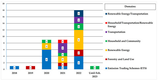 Figure 6 shows the distribution and domains of publications by year. It is noteworthy that the topic of blockchain implementation for carbon markets became attractive for researchers only in 2018. Despite that fact, in 2019 the topic also was not comprehensively studied. However, starting in 2020, the number of relevant publications began to increase. As a result, the number of publications for 2022 was the number for 2020 and 2021 combined. This indicates the increasing interest in the possible implementation of blockchain technology in carbon markets. Nonetheless, results show that it is still in the early stage of development, since the related topic received scholars’ attention only in 2018. Table A1 in Appendix C shows category, author(s), year, title and journal of the articles included in this SLR.