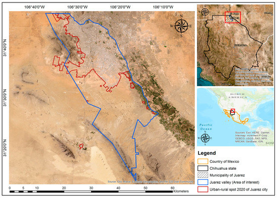 Location of the area of interest (AOI) over the Juárez Valley in Chihuahua, Mexico. Source: own elaboration based on open data information [18].