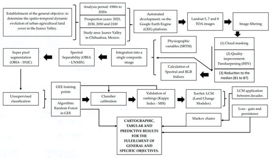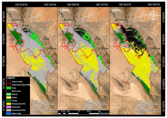 The general aim of this study was to use GIS and satellite remote sensing (RS) technologies to address the problem of cartographic updates of land cover between 1980 and 2020 and the historical and current analysis of its losses, gains and permanence. Additionally, the study aimed to perform a prospective analysis towards 2100 of the state of urban and agricultural land cover over the Juárez Valley in Chihuahua, Mexico.