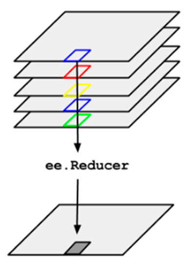 Algorithms were developed on the GEE platform to analyze the multitemporal images. Date, boundary and cloud percentage filters were applied, and, subsequently, multispectral bands with spectral and spatial resolution were selected for the development of supervised and unsupervised classifications. Since the scenes available in the platform already have an atmospheric correction, this process was not applied. Date filters covering months with a lower percentage of cloud (<10%) were used next, and the boundaries (AOI) were loaded to the data warehouse and served as a mask file for extraction. Based on the filtered scenes, statistical reducers where the output is calculated per pixel were applied so that each pixel of the output was composed of the mean value of all images in the collection at that location (Figure 3) [20,21,22,23,24].