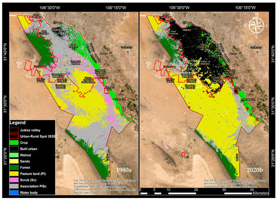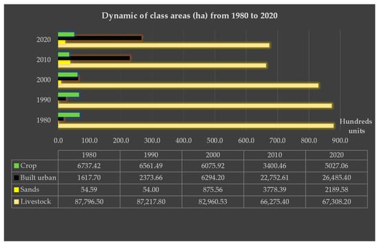 The coverages were generalized into four classes: crops (crop, which integrates agricultural crops and walnut), built urban, sands (desert), and livestock (forest—forest, pasture land—pasture, scrub—scrub, association PlSc—association of pasture and scrub and water body—water bodies of small watering places). Table 4 shows the calculated areas in hectares for each of these classes for the years 1980 and 2020.