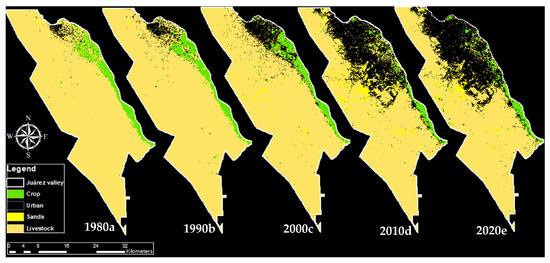It was also detected that the agricultural and crop areas that developed towards the eastern region in the initial decade from 1980 to 2020 were consolidated as built urban areas, which was confirmed by Quijada and Chávez [56], indicating that this phenomenon has been registered since 1940, expanding the urban over flat areas, such as the agricultural areas located to the west of the city and which is reiterated in Pérez and Romo [13], an effect that is noted in the results of Figure 3, Figure 4 and Figure 5.