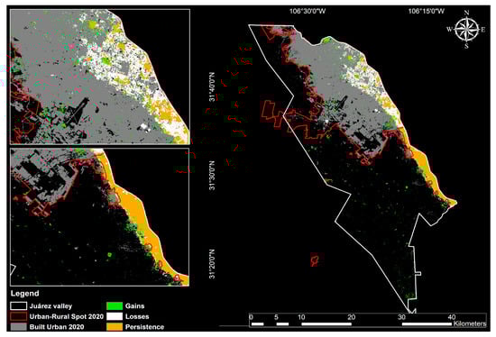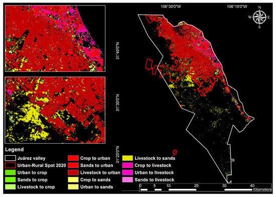 For the year 1980, between 6561.49 and 6737.42 ha of crop area were counted, while, for the year 2020, 5018.06 and 5027.06 ha were detected, with a loss of 1710.36 ha. This last result coincides with the problems mentioned by Martínez et al. [14] and was located and delimited by the municipal administration in 1986–1989. The previous result coincides with what was obtained and is framed cartographically in Figure 6 with the legend in red tones, where the change of crops towards the built urban in the historical period is shown. The net loss of crops is identified in Table 9, showing that it was a value of 1675 ha, while the net gain over all urban land uses was 19,962 ha between 1980 and 2020, where crops had a net contribution to the urban built-up area of 1773 ha in the historical period; this type of dynamic was also mentioned by Martínez et al. [14] in a region close to the Juárez Valley, that is, over the Rio Conchos basin.
