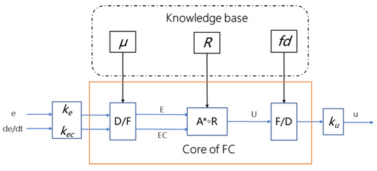 The work process of an FC controller can be briefly depicted in Figure 2, it mainly contains three steps: fuzzying, fuzzy inference, and defuzzifying. Herein, there are three gains in a PID controller; thus, three groups of such fuzzy inference are involved.