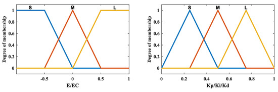 Figure 3. Membership functions (three subsets) for the input (E and EC) and output (Kp, Ki, and Kd) variables.