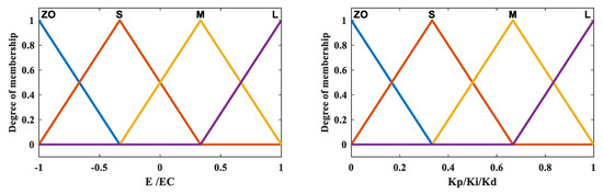 Figure 4. Membership functions (four subsets) for the input (E and EC) and output (Kp, Ki, and Kd) variables.