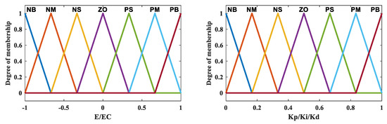 Figure 5. Membership functions (seven subsets) for the input (E and EC) and output (Kp, Ki, and Kd) variables.