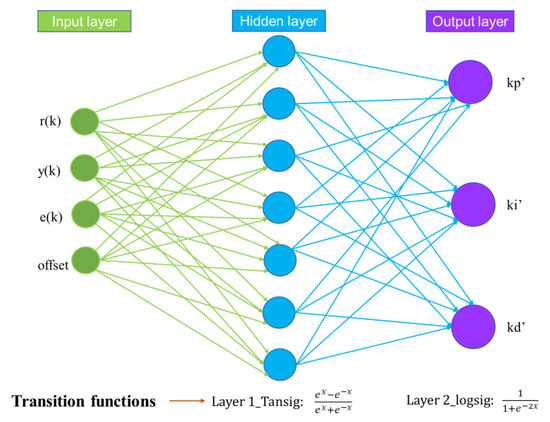 where e ( k ) = r ( k ) y ( k ) , is the error of the controlled variable, u ( k ) denotes the current controller output through the network tuning. In practice, due to the unknown y ( k ) Δ u ( k ) , as an approximation it is replaced by the sign function sgn [ y ( k ) Δ u ( k ) ] in practice. As k p , k i , k d are the elements of the network output vector O ( k ) , Δ u ( k ) O k ( k ) can be obtained according to Equation (9). Finally, add an inertial term that makes the search converge fast and globally minimal, and the weight adjustment formula becomes