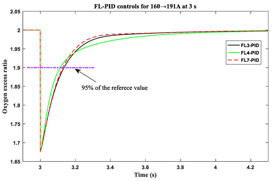 In the simulations, a constant setpoint value of 2 for the oxygen excess ratio was used first in a step response simulation, which allows the load current to change from 160 A to 191 A at 3 s. Figure 7 presents the OER responses with the PID gains tuned by three fuzzy inference systems, respectively, (corresponding control methods were named as FL3-PID, FL4-PID, and FL7-PID, respectively, according to the numbers of partitions of the respective fuzzy set). The purple line in the Figure 7 shows the 95% of the reference OER value, which eases the comparison of the settling times with these three controllers. Although the rising time of OER with FL4-PID is the shortest, the entire response is too sluggish with a settling time of about 1 s, which is obviously longer than 0.4–0.5 s in the other two cases. Comprehensively, the control methods using three subsets and seven subsets individually for the fuzzy set division behave better than the control using four subsets; furthermore, using seven subsets is a little faster than using three subsets to reach the final steady-state value.