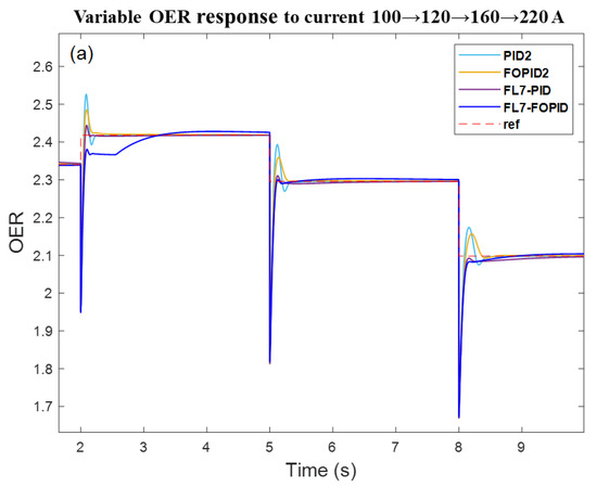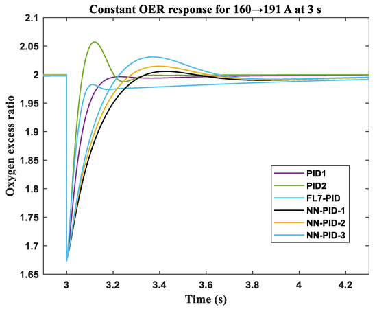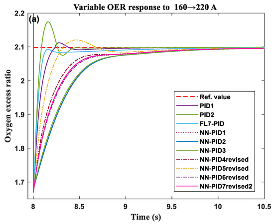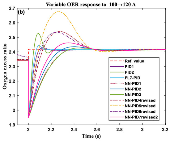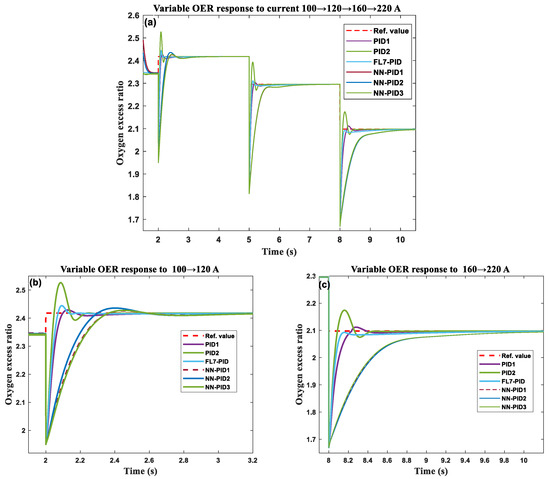 The simulation results for the variable control of the oxygen excess ratio are shown in Figure 11a. As to the first load current requests, the NN-PID control (three times of tests are showed) can reach the setpoint values with a smaller overshoot, but the settling time is approximately 1.2 s. It even gets worse that as the current increases, the settling times for the next two step load conditions become more and more longer (2 s and 2.5 s, respectively), although meanwhile overshoots gradually disappear. The FL7-PID fuzzy logic tuned PID method presents obvious advantages in the performance indices of both overshoots and settling time, and this could be observed clearly in the zoomed Figure 11b,c, which display the OER responses to the step load increases from 100 A to 120 A and from 160 A to 220 A, respectively. The settling times of FL7-PID concerned these two step loads are about 0.17 s and 0.25 s, respectively; for PID1 and PID2, the settling times are about 0.4–0.5 s and 0.45 s, respectively. Moreover, PID2 also exhibits considerably greater overshoots than PID1 and FL7-PID; the overshoot of PID1 on the condition of high load increases a little, while the overshoot of FL7-PID decreases clearly.
