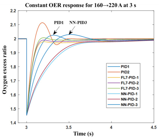 If the amplitude of the step load increases, such as from 160 A to 220 A (see Figure 9), there is also a certain overshoot with the PID1 control. On the other hand, the fuzzy logic tuned PIDs still present smooth curves and can be deemed as the best compared with the conventional PID and NN-PID methods; adjusting the quantification factor of I part for the FL7-PID method to a bigger value could fast enough make the oxygen excess ratio get more adjacent to the constant setpoint value (see FL7-PID-1, FL7-PID-2, and FL7-PID-3, with gradually increasing I-part coefficients); for example, the FL7-PID-3 exhibits quite a short rising time and reaches the setpoint value within less than 0.2 s. For NN-PID control, still three test results are shown in Figure 9 (see NN-PID-1, NN-PID-2, and NN-PID-3), among which NN-PID-3 may be considered to exhibit close performance to PID1, except for a delay for settling time of approximately 0.5 s.