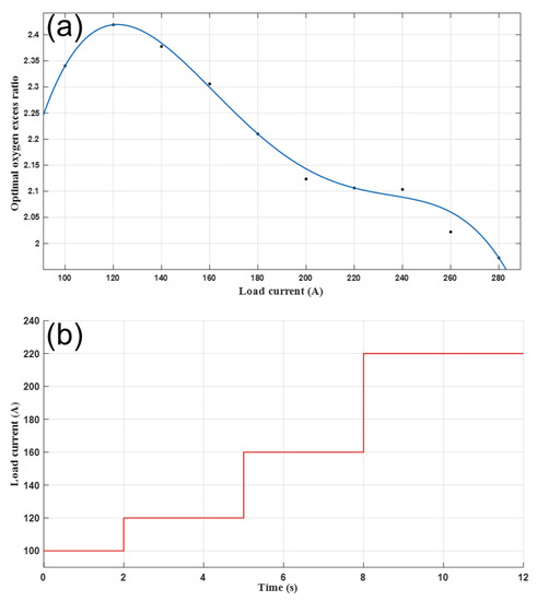 Figure 10a shows the optimal OERs when the load current changes. This curve was obtained from the data for steady states, nevertheless, could still be utilized here for providing a series of corresponding changeable setpoints of the OER when the load current changes. It can be observed that the curve-fitted polynomial can represent the OER change with the load current well in the range of less than 220 A except for the point of 200 A; thus, a series of step load working conditions can be defined in Figure 10b for variable OER simulation tests, in which different OER reference values are generated conveniently by the polynomial.