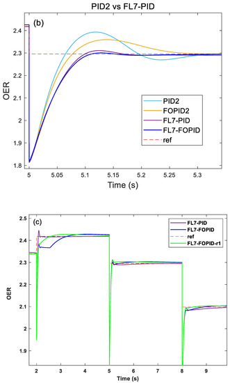 Figure 11. Step responses of variable OER with four PID controls: (a) total response tests including the three transients; (b) zoomed up display for the transient at 2 s; (c) zoomed up display for the transient at 8 s.