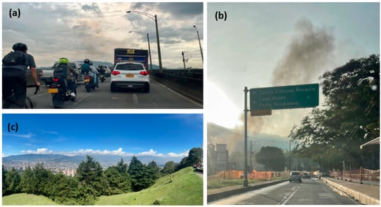 Environmental pollution in Medellin, Colombia. (a,b) pollution generated by vehicles in different areas of the city; (c) haze generated by pollution in Medellin.
