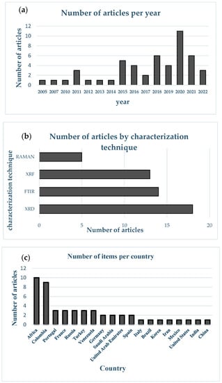 Search results: (a) quantity of articles per year, (b) quantity of articles per characterization technique, (c) quantity of articles per country.