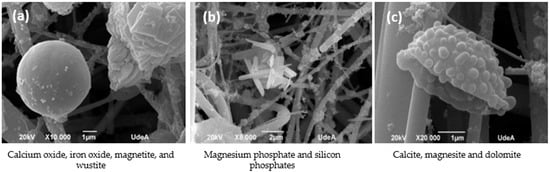 According to several studies, PM minerals identified in the atmosphere are composed of silicates, oxides, sulfates, carbonates, and other minerals, see Figure 4 and Table 2. Silicates are present as quartz (SiO2), illite, smectite, wollastonite (CaSiO3), vermiculite (MgAlFeSiO7), kaolinite (Al₂Si₂O₅(OH)₄), and calcium and aluminum silicates. Oxides are found as calcium oxide, iron oxide, magnetite (Fe3O4), and wustite (FeO) [,,,]. The sulfates occur as gypsum and koktaite (NH4)2Ca(SO4)2, while the phosphates are found as magnesium phosphate (Mg2P2O7) and silicon phosphates (SiP2O7) [,,,]. Carbonates could appear as calcite, magnesite, and dolomite (Ca(Mg(CO3)2, which is considered an additive in Portland cement [,,,].