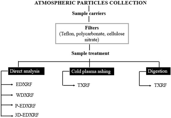 Different authors prefer to use the XRF (X-ray fluorescence) technique for the chemical characterization of particulate matter (PM) immersed in collection filters. This is because it allows multi-elemental analysis with a certain operational ease and does not require sample preparation. In addition, it is classified as a non-destructive technique []. These X-ray technologies use either photons or a focused beam of charged particles to excite electrons in the sample, enabling qualitative and quantitative analysis of trace matter []. The XRF analysis causes the ionization of atoms through an energetic X-rays beam. The emitted radiation by these ionized atoms in relaxation comprises qualitative and quantitative information from the elementals of a given sample [,,].