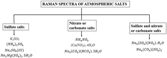 Nitrate and sulfate salts are present in atmospheric PM, while carbonate and bicarbonate can also play an important role in atmospheric chemistry. Depending on the crystalline structure, the normal modes of both displacement and splitting can appear in the Raman spectra [].